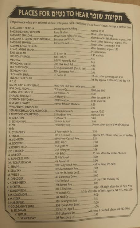 To Hear shofar blowing at Kimbal hospital in Lakewood call 732-364-3441 before YT or leave a message at the front desk. se below for list of tkias shofar for ladies